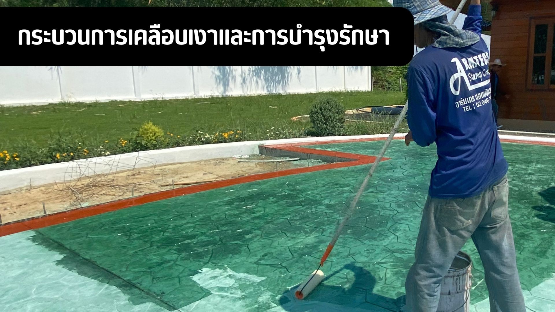 หลังจากการพิมพ์ลายเสร็จสิ้น การเคลือบเงาคอนกรีต เป็นขั้นตอนสุดท้ายที่สำคัญไม่แพ้กัน น้ำยาเคลือบเงาผิวสีจะช่วยปกป้องสีและลวดลายจากการสึกหรอ ฝุ่นผง และสารเคมีต่างๆ พร้อมทั้งเพิ่มความเงางามให้กับผิวงาน